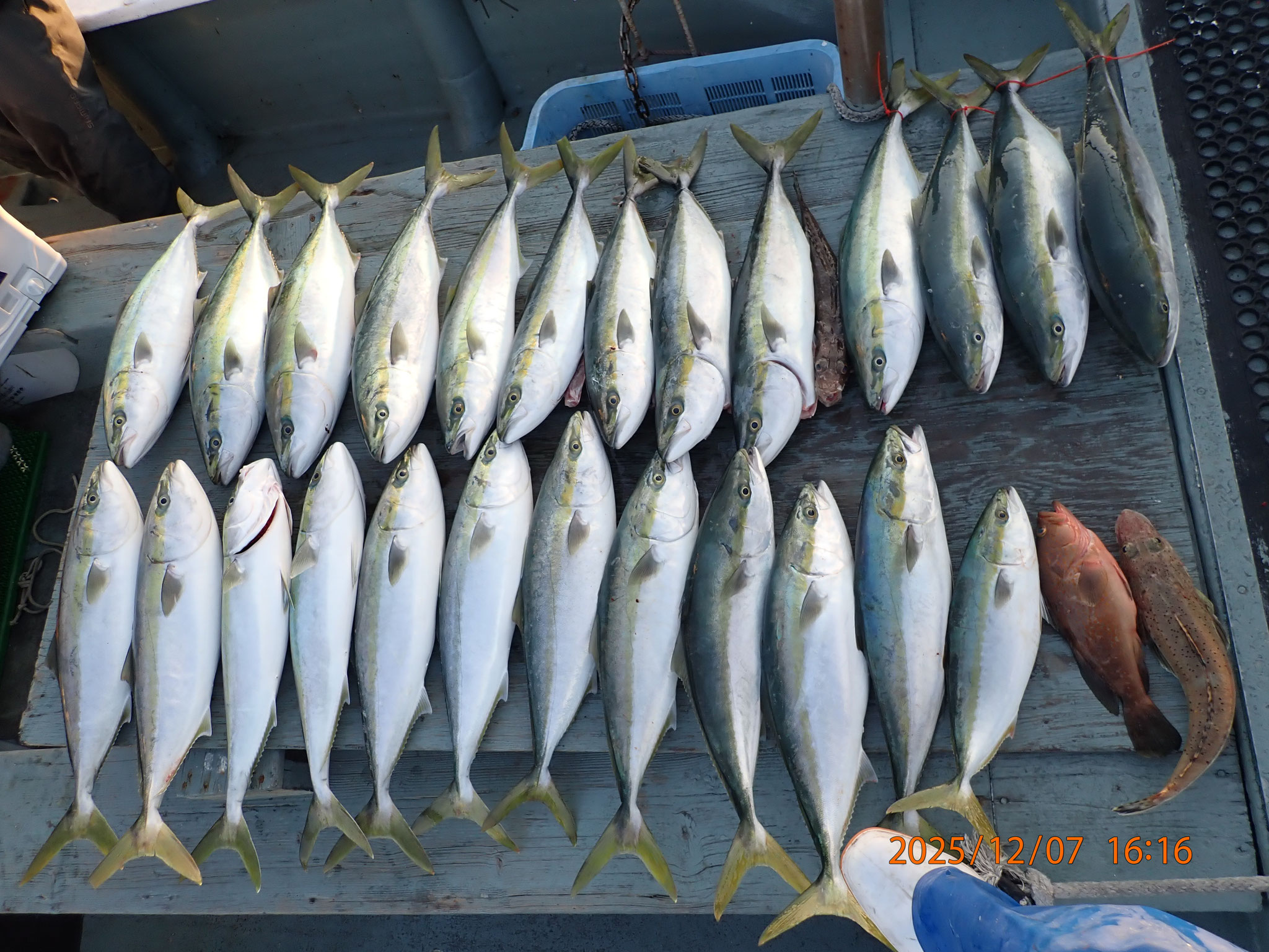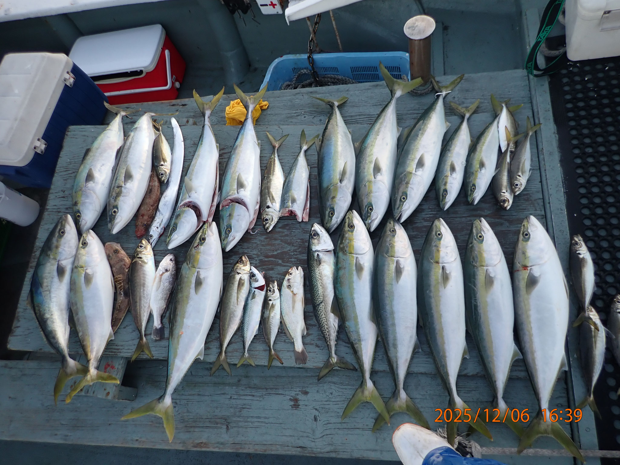 【釣果】 メジロ。70センチ前後、15匹。 ハマチ、50センチ、1匹。 マゴチ、50センチ、1匹。 タチウオ、70~105センチ33匹。...