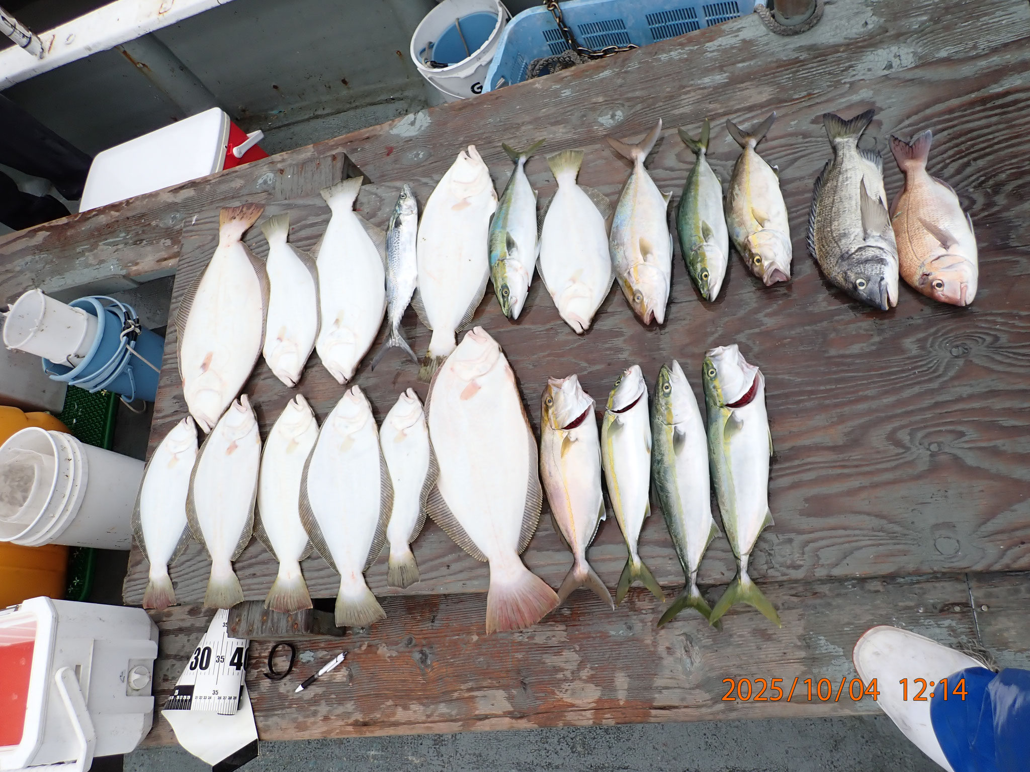 【釣果】お客様5名 ヒラメ、40~60センチ、11匹。 シオ、40~45センチ、3匹。 ハマチ、50センチ、5匹。 タイ、35センチ、1匹。 サゴシ、50センチ、1匹。 チヌ、45センチ、1匹。...