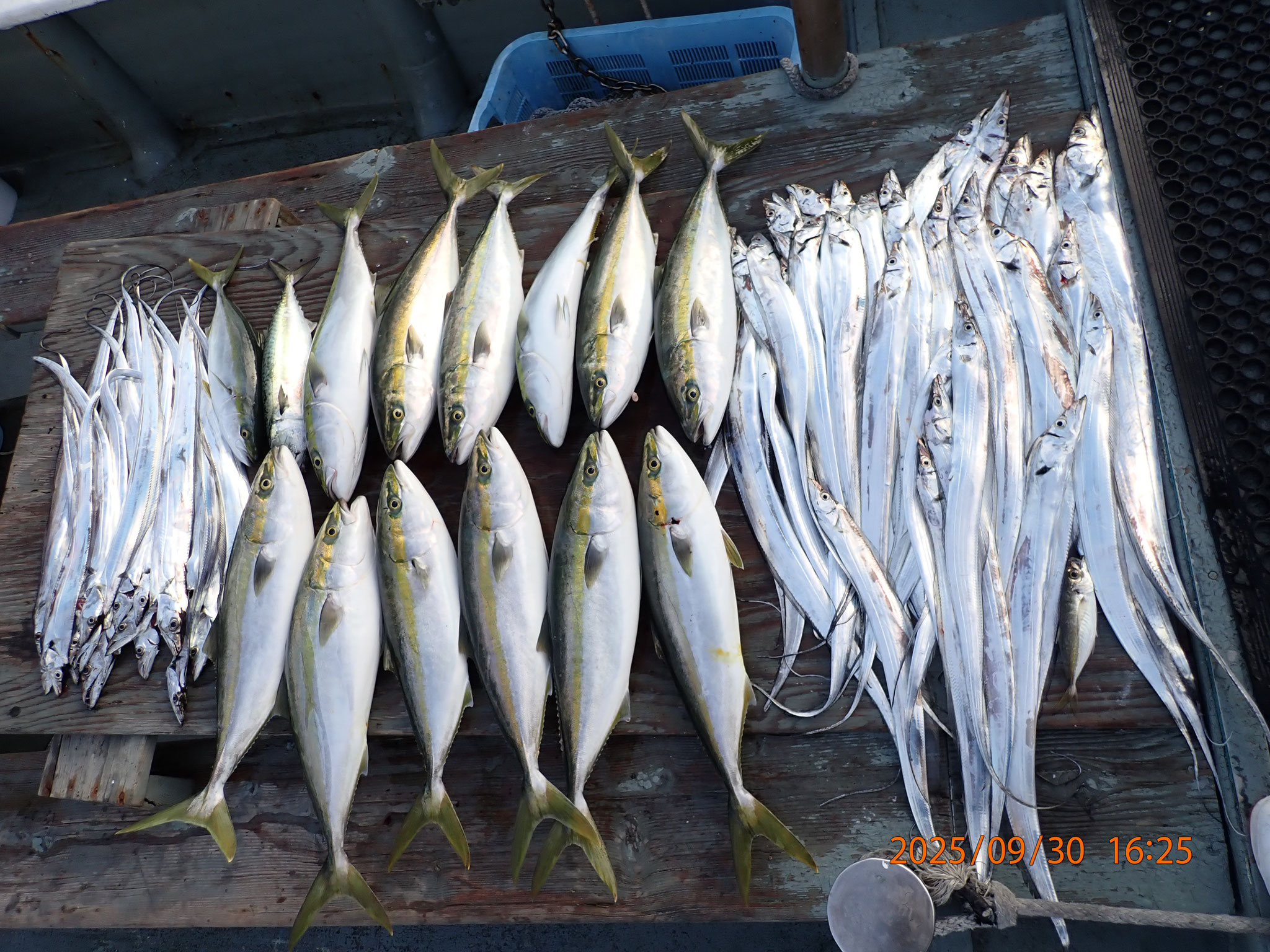 【釣果】お客様5名。 大ハマチ、60センチ前後、15匹。 タチウオ、70~105センチ、130匹。 今日は、朝の小あじ釣り、30分でした、朝一、緩い潮なので、太刀魚からスタート、洲本沖、好調です、良型交じりで多い人38匹、...