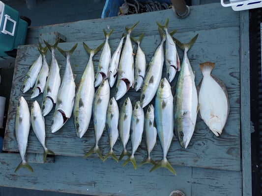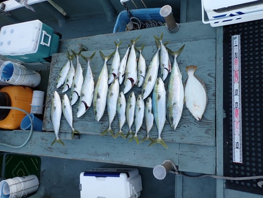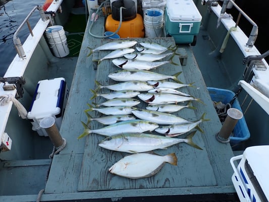 釣果 · 2月 05日, 2023年 今日は、飲ませ1本です。 釣果。 ブリ、80センチ、2匹。 メジロ、68~78センチ、8匹。 ハマチ、50センチ前後、11匹。 ヒラメ、50センチ、1匹。 今日は、10日ぶりの出船です、天気も良く、朝の餌のイワシ釣り順調でした。 飲ませボチボチ釣れ、ヒラメに、ブリ、メジロ、ハマチと、にぎやかでした、皆さん喜んで頂きました、 お疲れ様でした、有難う御座いました。 tagPlaceholderカテゴリ: