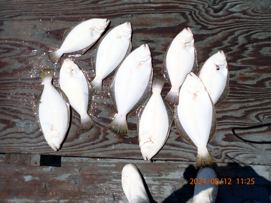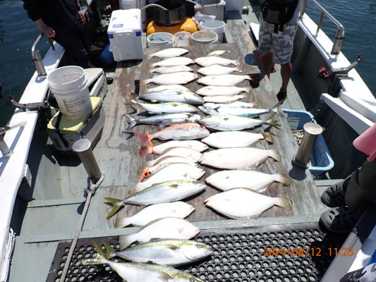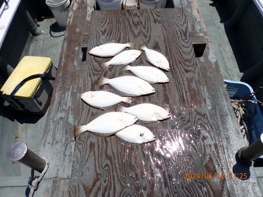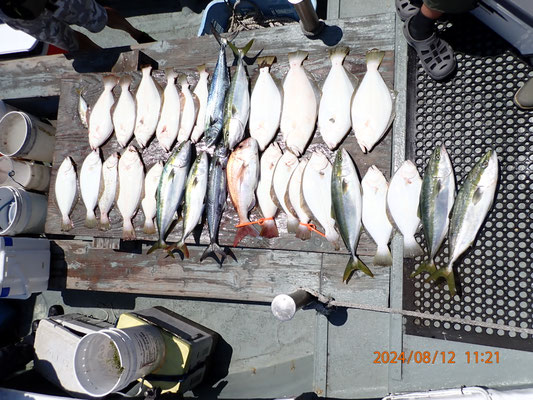 8月 12日, 2024年 今日は、関空ヒラメ便です、ヒラメ大爆釣です。 【釣果】 ヒラメ、40~58センチ、30匹。 タイ、58センチ、1匹。 大ハマチ、60センチ前後、6匹。 サゴシ、70センチ前後、2匹。 アジ、30センチ、1匹。 ツ゚バス、45センチ前後、リリース 今日は、朝の小あじ釣り、釣れました、今日も、ヒラメは、このシーズン1番の爆釣です、全員複数安打です、写真2部にしました、お疲れ様でした、有難う御座いました。 tagPlaceholderカテゴリ: