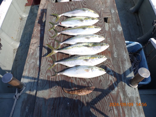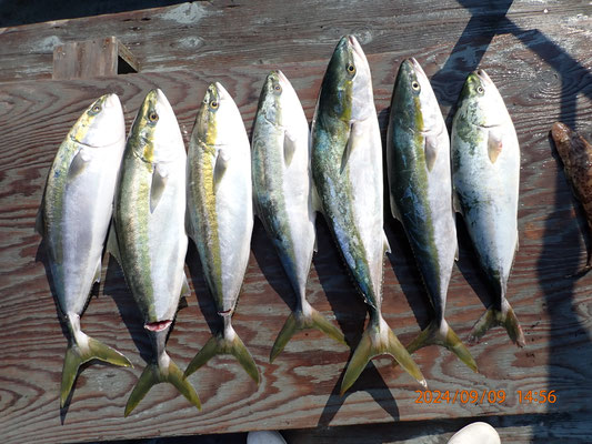9月 09日, 2024年 今日は、飲ませとアジです、 【釣果】お客様3名です。 ブリ、80~86センチ、2匹。 メジロ、70~76センチ、5匹。 ワニゴチ、50センチ、1匹。 今日も、朝の餌釣り、何とか確保、朝一から、飲ませの青物狙い、緩い潮でした、3流し目にメジロが来ました、其のあとも、良く当たり、10時には7匹、全員安打です、クーラーボックスがお客さん3人で80リッタークーラー1台で、入らないので、飲ませは終了、 アジ狙いに変更ですが、潮緩く、小ぶりばかりでした、強烈な引きを、楽しんでいただきました、御疲れ様でした。有難う御座いました。 tagPlaceholderカテゴリ: