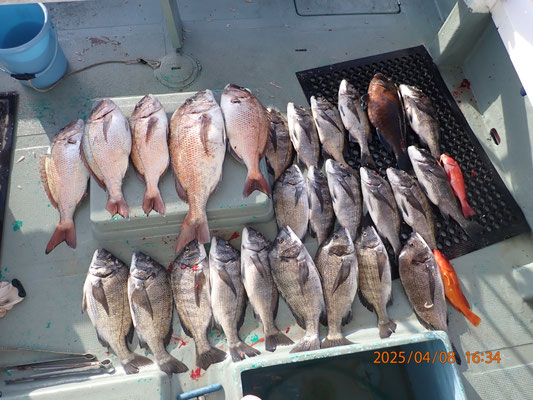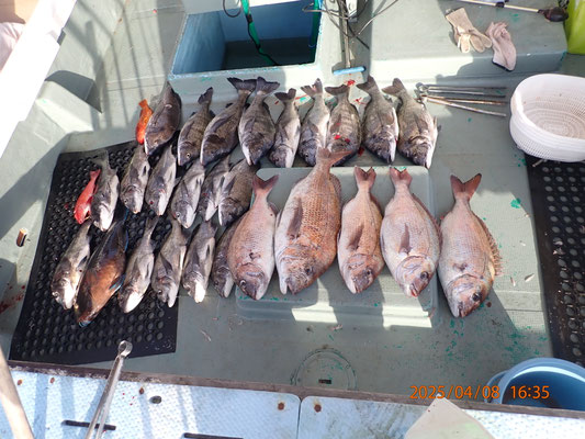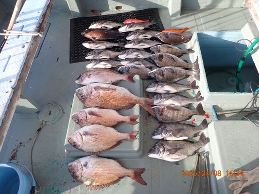 昼から、南西の風が出てきたので、湾内のタイ場に行き、タイ狙い、好調に釣れました。全員マタイ、ゲットです、クロダイ、少ない人でも4匹有りました、御疲れ様でした。
