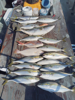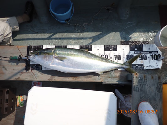 8月 16日, 2025年 今日は、飲ませの青物とヒラメ、狙いです、飲ませ好調です。 【釣果】お客様5名です。 ブリ、90センチ、1匹。 大ハマチ、58~60センチ、16匹。 ヒラメ、58センチ、1匹。 タイ、53センチ、1匹。 アコウ、36センチ、1匹。 アジ、28センチ、2匹。 加太方面、久々の青物とヒラメ好調に釣れました、4月以後、初のブリ、90センチは見事でした、やっと飲ませの季節が来たようです、 何しろ水温が、28度あり、どうなるものかと、思いましたが、潮さえ、良く流れたら、期待できそうです、ヒラメも釣れて、よかったです、御疲れ様でした。有難う御座いました。 tagPlaceholderカテゴリ:
