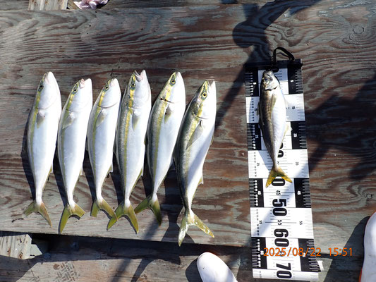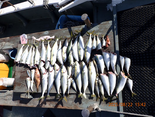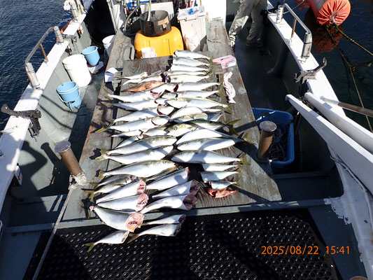 8月 22日, 2025年 今日も、飲ませと、アジ釣りです。飲ませ爆釣です。 【釣果】太ハマチ、33匹。解体にて姿を変えた、ハマチも有ります。 アジ、30~44センチ、19匹。 アコウ、43センチ、、1匹。 ガシラ、23センチ、1匹。 飲ませ、良く釣れました、午後、アジ釣りにしました、良型が釣れ、バラシがも沢山有りました、御疲れ様でした。有難う御座いました。 tagPlaceholderカテゴリ: