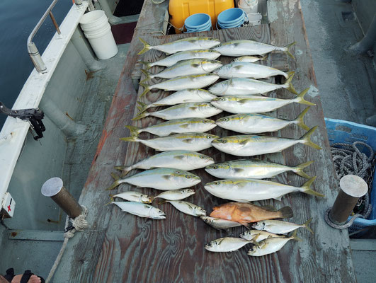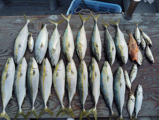 8月 23日, 2025年 今日も、飲ませとアジです。 【釣果】 大ハマチ、60センチ前後、18匹。 アコウ、40センチ、1匹。 アジ、27~33センチ、9匹。 サバ、37センチ、1匹。 今日は、風もなく、暑い1日でした、青物は昨日より、少し少ないですが、良く釣れてます、全員安打です、アジは中型のみでした、 御疲れ様でした。有難う御座いました。 tagPlaceholderカテゴリ: