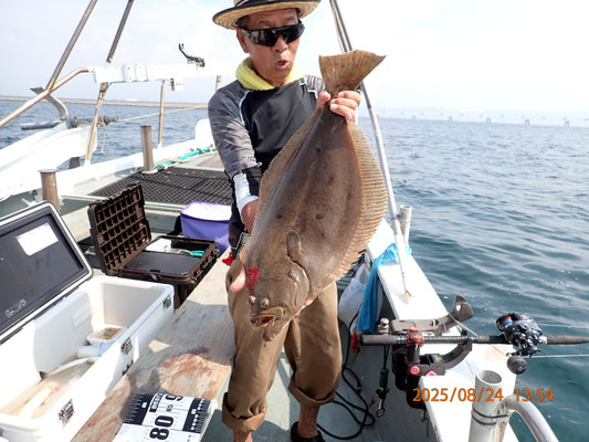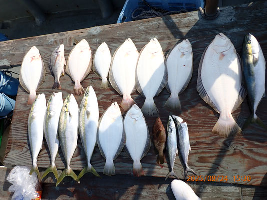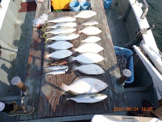 8月 24日, 2025年 今日は飲ませとひらめ狙いです、ヒラメ好調です。 【釣果】お客様4名。 ヒラメ、40~66センチ、9匹。 太ハマチ、60センチ前後、5匹。 アコウ、35センチ、1匹。 キビレ、33センチ、1匹。 サゴシ、50センチ、2匹。 今日は、朝一は、すこし小雨が降って、むしむししましたが、後は天気よく、暑かったです、ヒラメ狙い面白くなってきました。大ハマチも、良く肥えて釣りごたえ有りました、全員安打でした、御疲れ様でした。有難う御座いました。 tagPlaceholderカテゴリ: