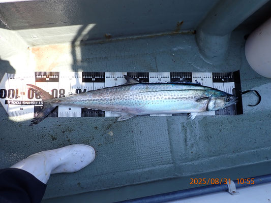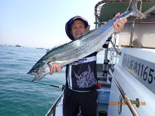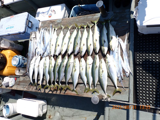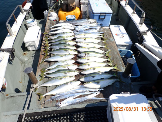 8月 31日, 2025年 今日は、飲ませと太刀魚です。 【釣果】お客様5名です。 大ハマチ、60センチ前後、24匹。 サワラ、95センチ、1匹。 タチウオ。70~85センチ、23匹。 今日は、朝一のタチウオは厳しかったです、8時から、飲ませに移動、これは緩い潮でしたが、良く釣れました、これも2時間ほどで、釣れなくなり、もう一度、太刀魚の戻りました、たまに釣れる程度です、午後からは、風もなく、潮も動かず、暑いので、ギブアップ、午後1時前に、早仕舞いでした、御疲れ様でした。有難う御座いました。人数が少ないときには、太刀魚釣りの時、鰆狙いもいいですね。 tagPlaceholderカテゴリ: