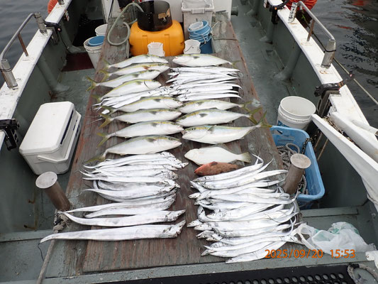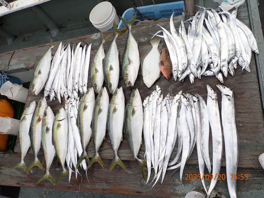 9月 20日, 2025年 今日も、飲ませと太刀魚です。 【釣果】お客様4名 大ハマチ、60センチ前後、12匹。 タチウオ、70~100センチ、60匹。 ヒラメ。48センチ、1匹。 アコウ、37センチ、1匹。 今日は、曇り空で、過ごしやすい天気でした、しかし午後は。南風強くなり、2時過ぎに切り上げました、、飲ませも、太刀魚も、良く釣れてます、お疲れ様でした、有難う御座いました。 tagPlaceholderカテゴリ: