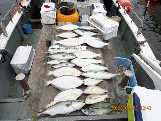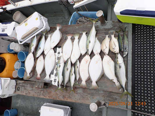 9月 23日, 2025年 関空ヒラメ便です、好調に釣れました。 【釣果】お客様7名。 ヒラメ45~65センチ、12匹。 大ハマチ、60センチ前後、5匹。 ツ゚バス、40センチ、3匹 ハモ、105センチ、1匹。 サゴシ、50センチ、1匹。 キビレ、40センチ、2匹。 今日は、風もなく。釣り日和でした、皆さんがんばっていただき、全員安打でした、お疲れ様でした、有難う御座いました。 又、27日、ヒラメ便です、、後3名募集中。 tagPlaceholderカテゴリ: