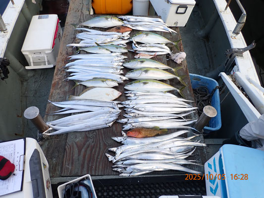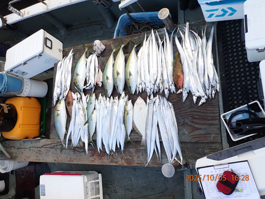 10月 05日, 2025年 今日も、飲ませと太刀魚です。 【釣果】 メジロ、65~70センチまで、5匹。 ツ゚バス、40センチ前後、3匹。 アコウ、35センチ、2匹。 タチウオ、70~90せんち、80匹。 ヒラメ、50センチ、1匹。 タイ、30センチ、1匹。 今日は、時折小雨の降る、天気でした、朝一から、洲本沖深場の太刀魚です、早い上り潮で、太刀魚も厳しかったです、いつものドラゴン サイズはなかったです、飲ませも、厳しく、3匹釣った人が、最高でした、お疲れ様でした、有難う御座いました。 tagPlaceholderカテゴリ: