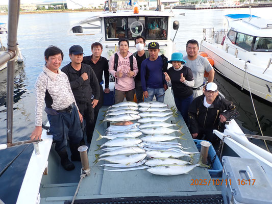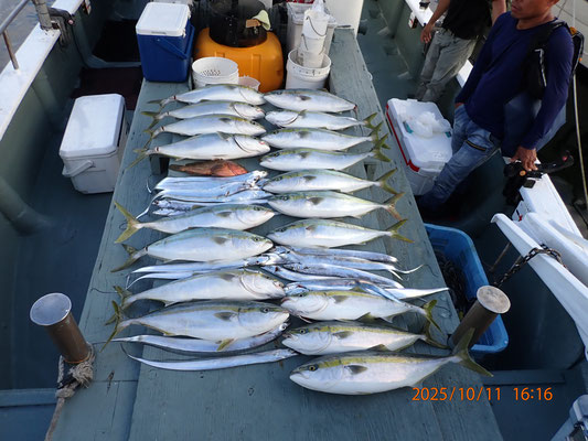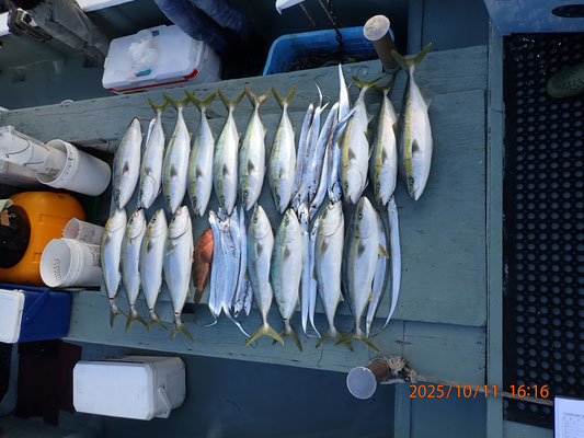 10月 11日, 2025年 今日も、飲ませと太刀魚です。 【釣果】 メジロ、70センチ前後、18匹。 アコウ、35センチ、1匹。 タチウオ、70=85センチ、19匹、 今日は、台風明けの、貴重な1日です、園田様グループのチャーター便です、餌の小あじ釣りも良く釣れました、一路のませのポイントへ、1流し目から釣れ、其のあともぼちぼちと釣れて、11時半の、太刀魚ポイントへ移動、ところが、これが潮早く、釣れません、頑張ってみましたが、厳しかったです、太刀魚は少しはいますが、なかなか釣れません、、お疲れ様でした、有難う御座いました。 tagPlaceholderカテゴリ: