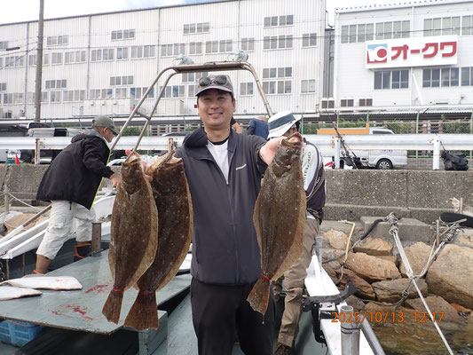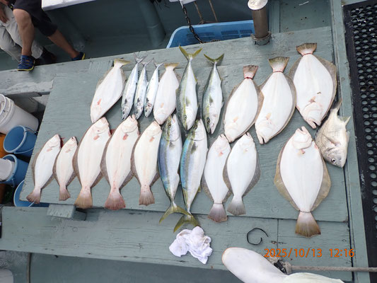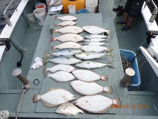 今日も、餌の小あじ、近場で釣りました、ヒラメポイントは、朝から北西の風強く、厳しい釣りでした、皆さん頑張って頂いて、ヒラメ、全員安打です、中でも、当船初めての乗船、池田様、見事、良型ばかり3匹は、最高の釣果、ビギナーズラックです、これからもバンバン釣って、下さいね、ありがとうございます。お疲れ様でした。
