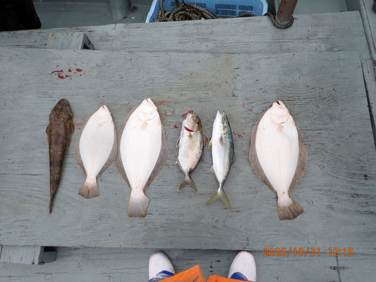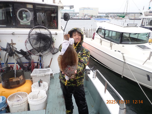 10月 31日, 2025年 今日は、関空ヒラメ便です。 【釣果】お客様4名 ヒラメ、45~55センチ、3匹。 シオ、40センチ、1匹。 ツ゚バス、48センチ、1匹。 今日は、朝から小雨の降る、寒い日です、風もやや強く厳しい釣りです、初めてヒラメ釣りをする方も、何んと55センチ、良型をゲット、良かったですね、この厳しい天気にも負けず、頑張って頂き、お疲れ様でした、有難う御座いました。 tagPlaceholderカテゴリ: