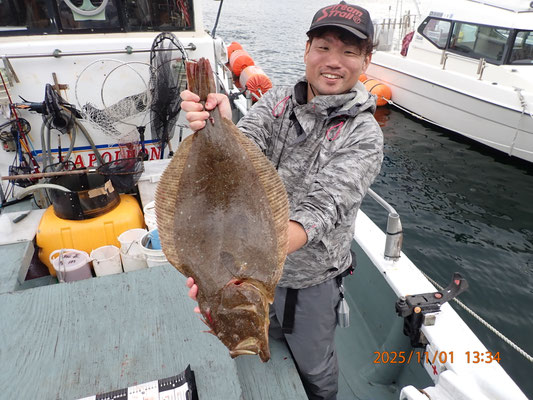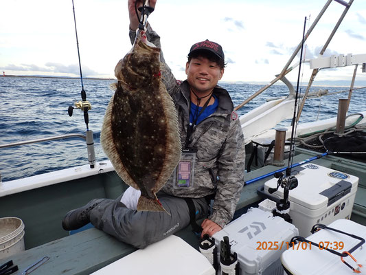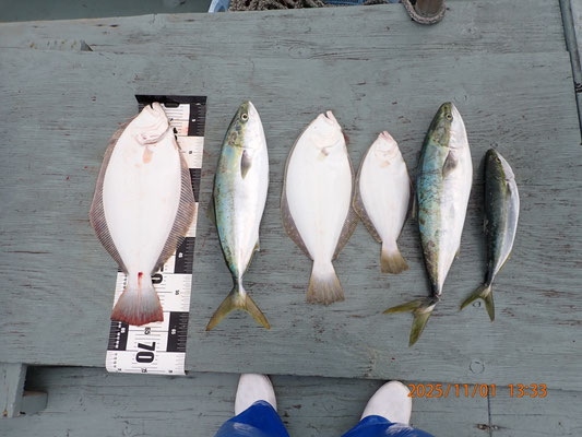 11月 01日, 2025年 今日も、関空ヒラメ便です。 【釣果】 ヒラメ、40~65センチ、3匹。 メジロ、65センチ、2匹。 ハマチ、50センチ、1匹。良かったですね 今日も、北西の風強く、良くないパターンですが、その中でベテラン組を抑え、見事65センチY様と、2匹ったK様、おめでとうございます、後は青物でした、お疲れ様でした、有難う御座いました。 tagPlaceholderカテゴリ: