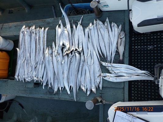 11月 16日, 2025年 今日は、太刀魚1本です。 【釣果】 タチウオ、70~115センチ、122匹。 クログチ、40センチ、1匹。 今日は、太刀魚狙いの、お客さんグループでした、皆さん良型のタチウオ、沢山いました、久しぶりです、お疲れ様でした、有難う御座いました。 tagPlaceholderカテゴリ: