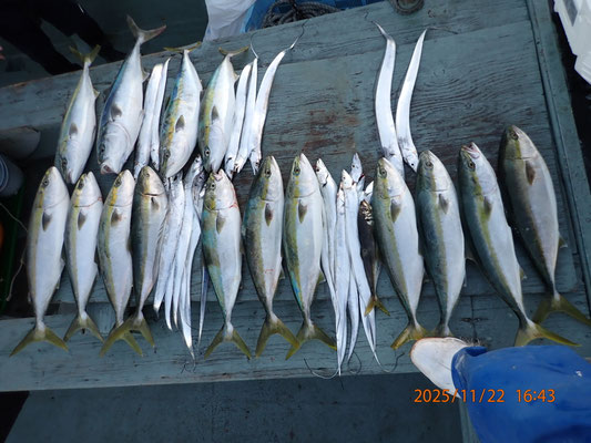 11月 22日, 2025年 今日も、飲ませと太刀魚です。 【釣果】 メジロ、70センチ前後、14匹。 タチウオ、90センチまで、19匹。 アジ、37センチ、1匹。 今日は、朝一の餌が、いつもの場所にいなくて、どうなるのかと思いましたが、何とか釣れました、まず飲ませ方スタートです、上り潮早く、期待しましたが、なかなか口を使ってくれません、1匹釣れてから、何とか釣れるようになりました、粘りでした、太刀魚は、なかなか厳しかったです。お疲れ様でした、有難う御座いました。 tagPlaceholderカテゴリ: