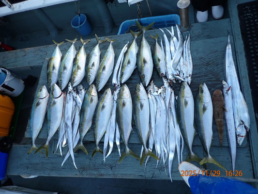11月 29日, 2025年 今日も、飲ませと太刀魚です。 【釣果】 メジロ。70センチ前後、15匹。 ハマチ、50センチ、1匹。 マゴチ、50センチ、1匹。 タチウオ、70~105センチ33匹。 今日も、餌の小あじ、順調に釣れ、30分で終了、まず、飲ませから、朝一から、バタバタと釣れました、その後、太刀魚狙いです、潮緩く、洲本沖ですが、、ぼちぼち釣れました、永谷様、見事ドラゴンサイズ、ゲット、良かったですね、お疲れ様でした、有難う御座いました。 tagPlaceholderカテゴリ: