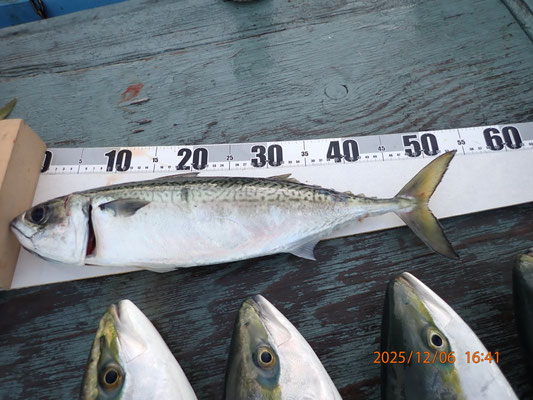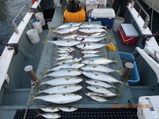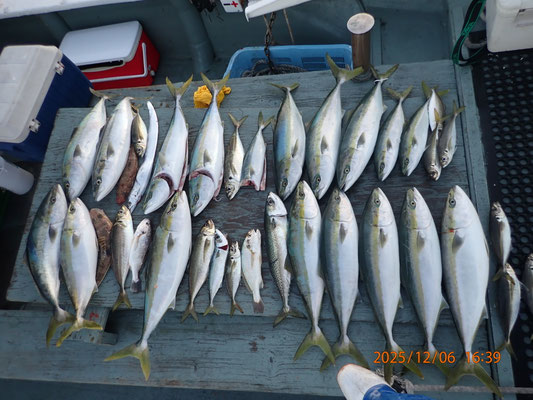 12月 06日, 2025年 今日は、飲ませとアジです。 【釣果】 メジロ、70~73センチ、15匹。 ハマチ、50センチ、、3匹。 アジ、30~46センチ、11匹。 サバ、54センチ、1匹。 マゴチ、45センチ、2匹、 タチウオ、80センチ、1匹。 グチ、30センチ、2匹。 今日も、餌の小あじ良く釣れました、朝から飲ませです、良く肥えたメジロ、順調です全員安打、多い人5匹、久々に大アジ狙いらいしました、大漁とはいきませんが、良型を見ることが出来ました、御疲れ様でした、有難う御座いました。 tagPlaceholderカテゴリ: