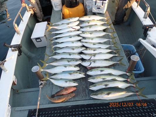 12月 07日, 2025年 今日も、飲ませとひらめ狙いです、メジロ爆釣です。 【釣果】 メジロ、70センチ前後、24匹。 マゴチ、50センチ、2匹。 アコウ、37センチ、1匹。 今日も、餌の小あじ、良く釣れました、朝からのませ、好調です、午後にヒラメ狙いしましたが、コチが2匹だけでした、御疲れ様でした、有難う御座いました。 tagPlaceholderカテゴリ: