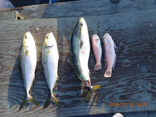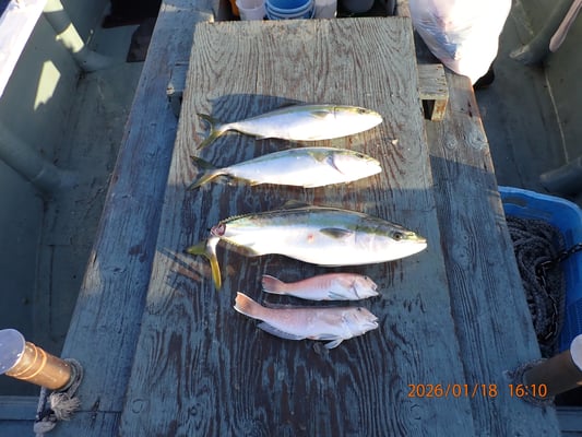 1月 18日, 2026年 今日も、飲ませとアマダイです。 【釣果】お客様3名です。 ブリ、85センチ、1匹。 メジロ、73センチ、2匹。 白アマダイ、35~40センチ、2匹。 今日は、餌釣りの後、すぐに、アマダイ釣りに、行きました、昼前まで頑張って、何とか2匹でした、きびしかったですね、午後、飲ませの青物、これも色々場所を変え、何とか3匹釣れました、お疲れ様でした。ありがとうございました。 tagPlaceholderカテゴリ: