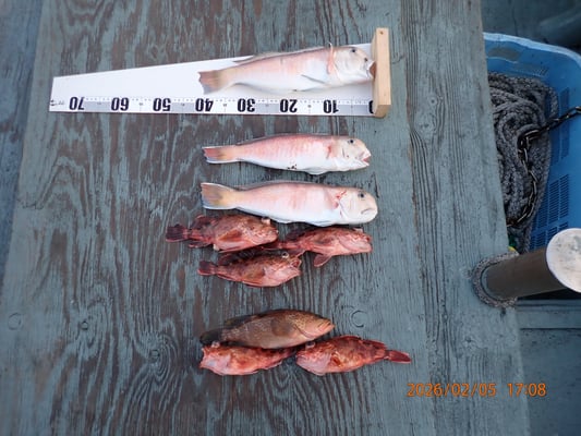 2月 05日, 2026年 今日は、1つテンヤ、と、白アマダイねらいです。 【釣果】 白アマダイ、38~42センチ、3匹。 ガシラ、20~26センチ、5匹。 アコウ、30センチ、1匹。 今日は、最高の釣り日和でした、あさ一の、1つテンヤは、全員初めてです、釣れたのは、ガシラです、10時から移動して、アマダイポイんとへ、これがまた、潮動かず、苦戦です、頑張っていただき、何とか、良型が3匹でした、2つを狙うと、いけませんね、1本に絞ったほうが、賢明でしょうか。お疲れさまでした、ありがとうございました。 tagPlaceholderカテゴリ: